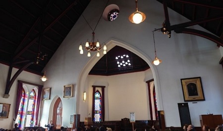 1886年に建築され、美しいステンドグラスが目を見張る建物で、プロテスタント礼拝堂では日本最古のものと言われております。