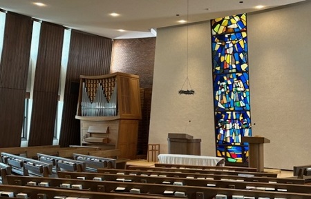 イエスの受難を表す「茨の冠」、正面のステンドグラスは田中忠雄画伯によるもので、最上段には再臨のキリスト、使徒パウロとペテロ、4人の福音書記者、そして日本を表す「だんだん畑」が描かれています。そしてステンドグラスの傍らには田中忠雄画伯の絵画があり、キリストを見上げて人々が手を合わせているように描かれています。
