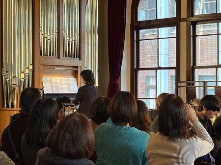 パイプオルガン奏者、加藤真子先生からは、オルガンの音が出る仕組み等のお話を丁寧にしていただいたのち、パイプオルガンを演奏していただきました。日常では決して味わうことのできない非常に貴重な体験であり、荘厳な演奏にご父母の皆様は聞き入っていました。