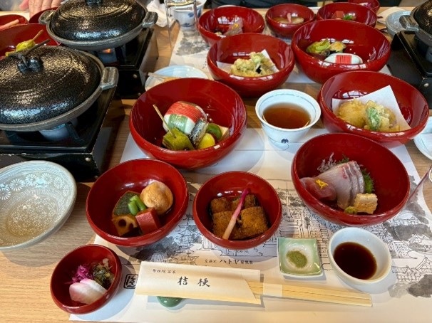 昼食は、豊臣秀吉が亡き、愛児 鶴松の菩提を弔うために創建した「祥雲禅寺」を前身とする名刹 智積院を訪れ、境内の会館にある茶寮「桔梗」で京料理をいただきました。季節の食材を使った上品な味わいの料理で、京都らしい落ち着いたひとときを楽しむことができました。
