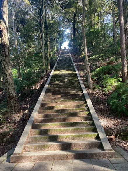 昼食後は、智積院の境内を通り抜け、豊国廊を訪れました。こちらは、豊臣秀吉を祀る場所で約500段もある長い石段を上がった先に静かに建っています。こちらでは、石段を登る人、下から見守る人に分かれました。500段の往復にはおよそ20分かかり、登った頂上からは清水寺を臨むことのできる絶景が広がっていました。